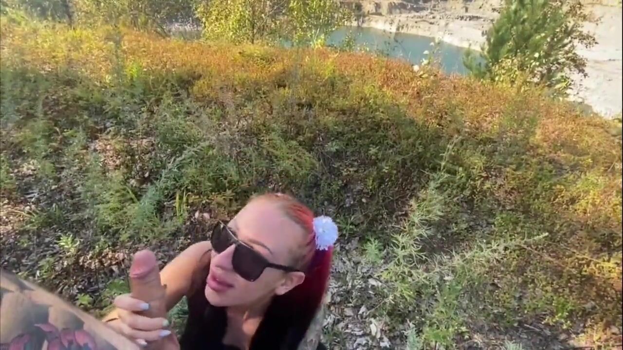 Redhead slut gives outdoor blowjob and gets doggystyle fuck