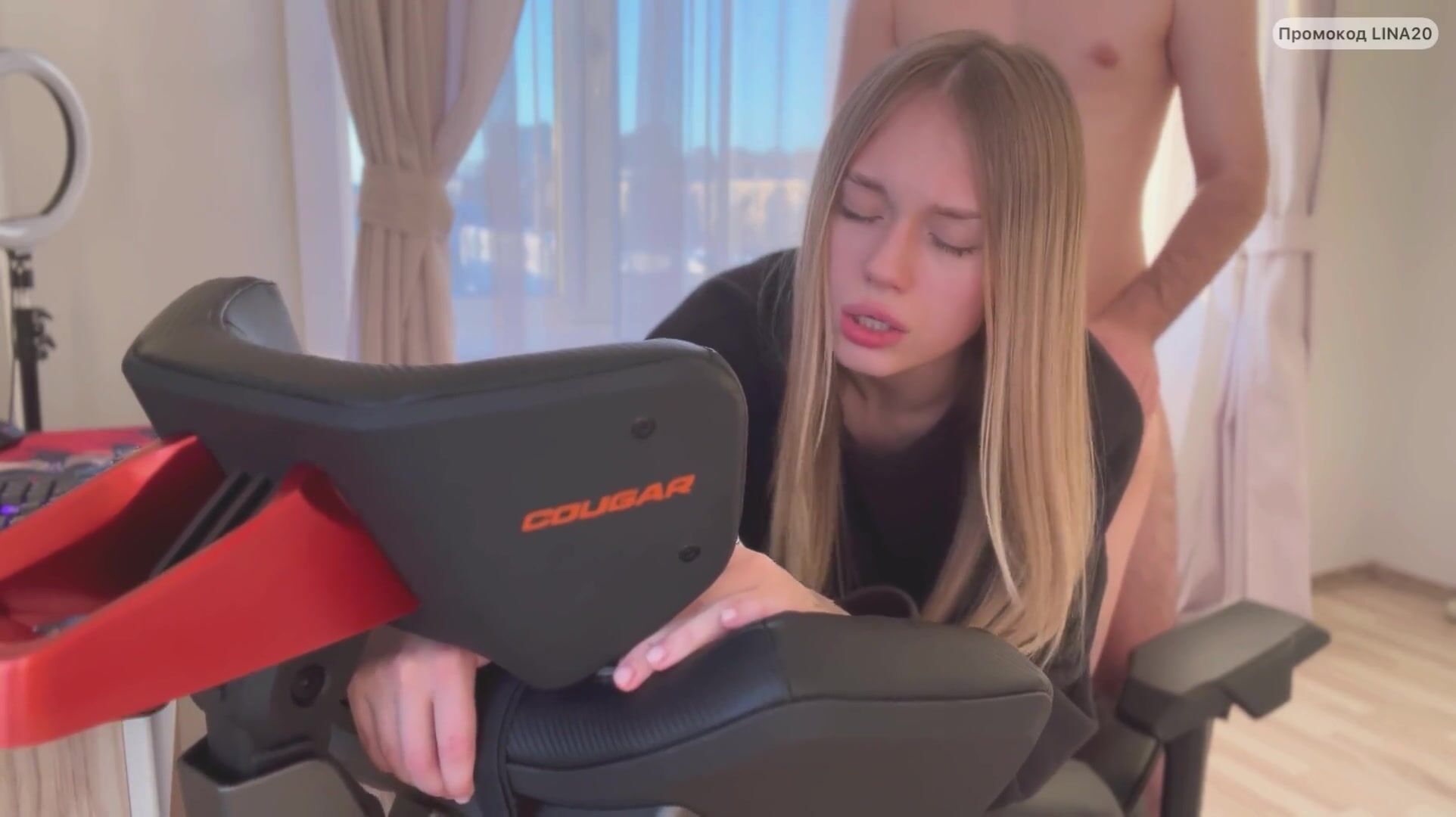 Doggystyle on the gamer chair and she takes his cumshot in her mouth