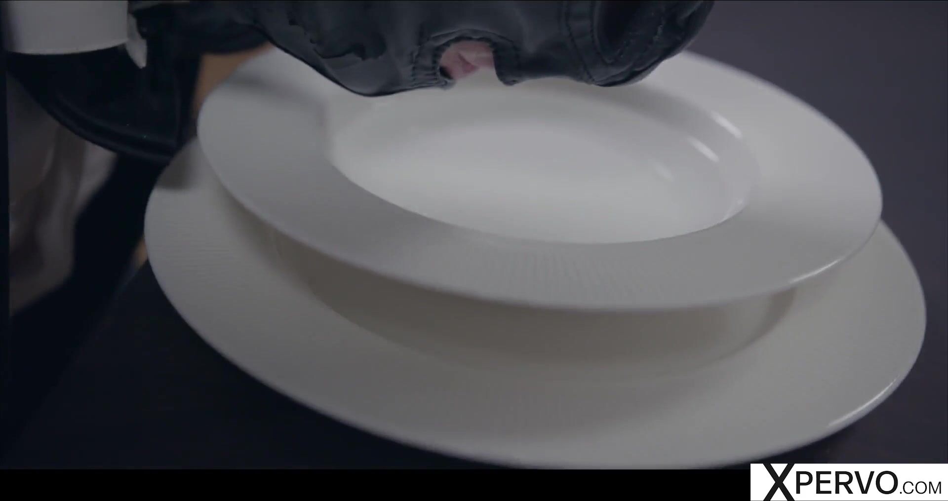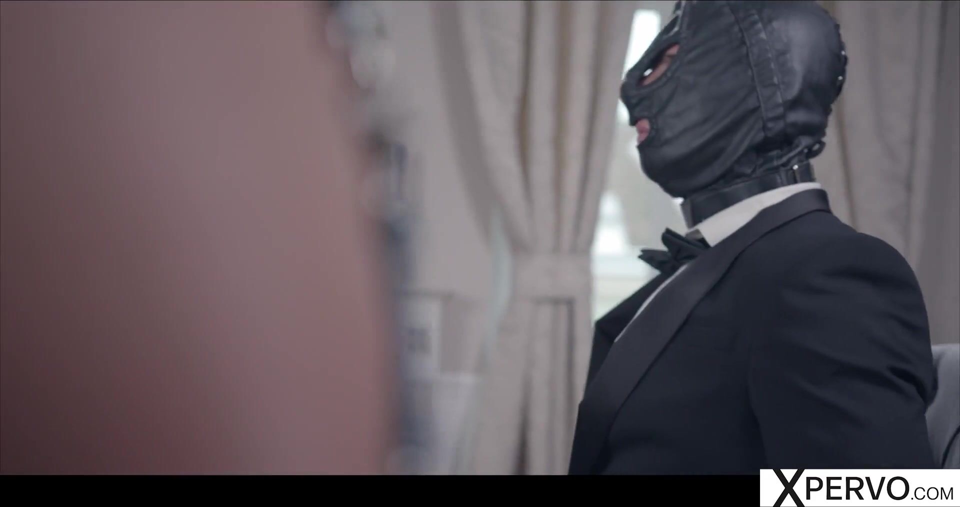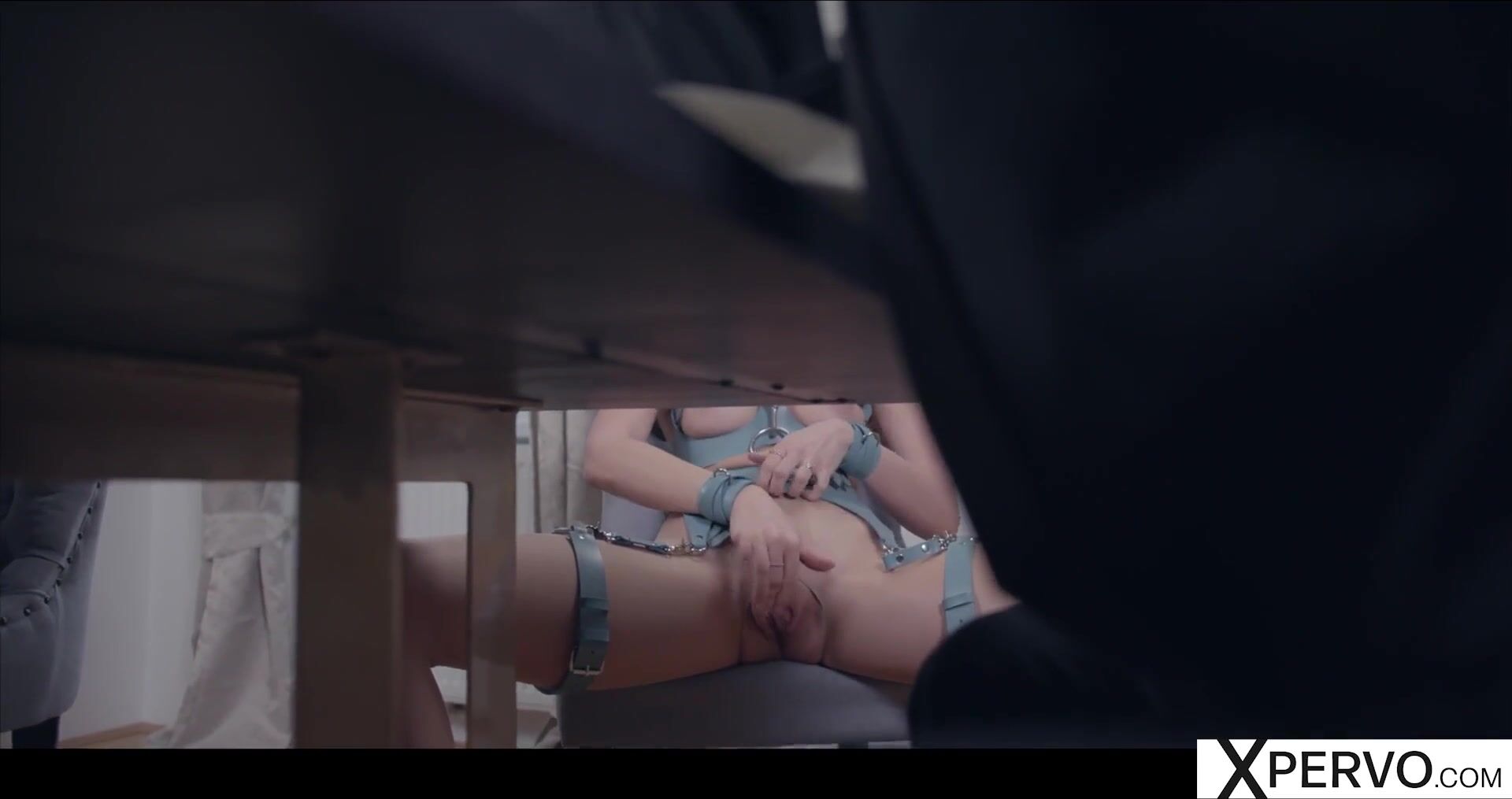 Little Caprice has cuffed and hooded sub lapping bowl while she fingers